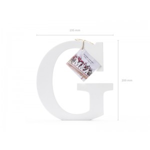 Drevené písmeno G bielej farby, šírka cca 19,5 cm, výška cca 20 cm.