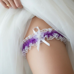 Čipkovaný podväzok s tmavo modrou stuhou zdobenou ružičkou.