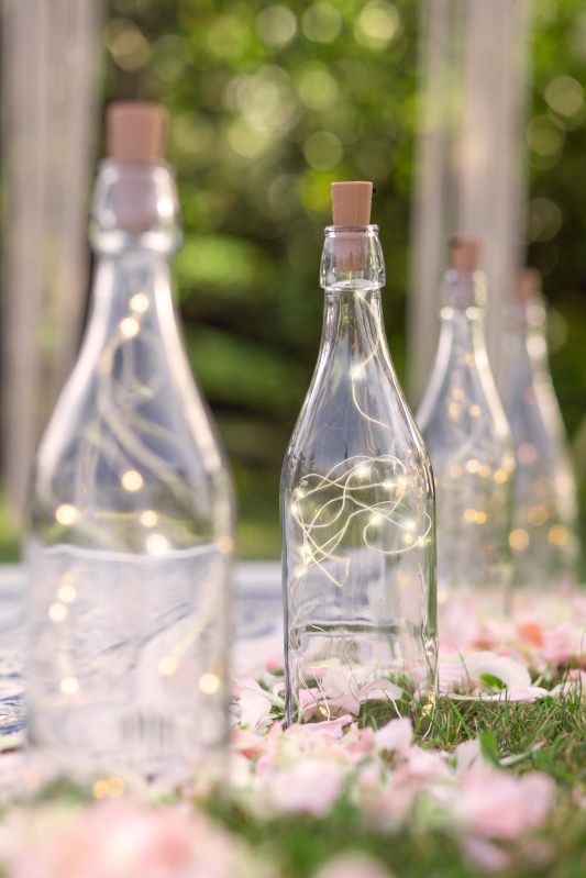 Použite svetielka v čírych fľašiach od vína rozmiestnených pozdĺž uličky k oltáru alebo ako centrálnu dekoráciu na každý stôl. Pre ešte silnejší efekt môžete skombinovať viac fliaš vedľa seba – v tme vytvoria nezabudnuteľnú romantickú atmosféru. Fľaša nie je súčasťou balenia.