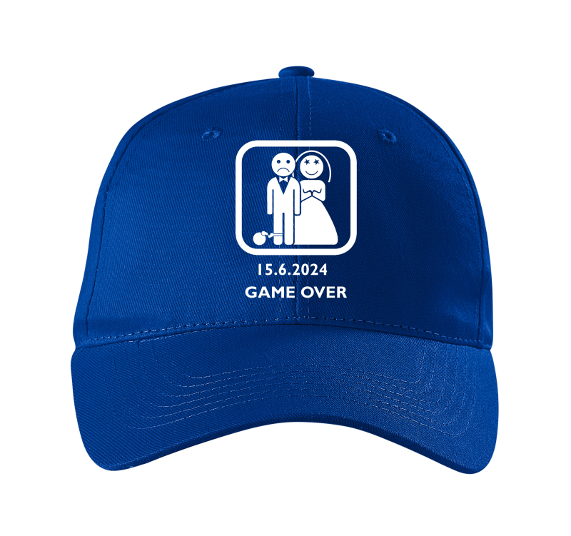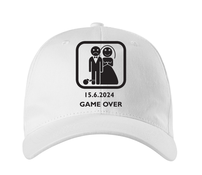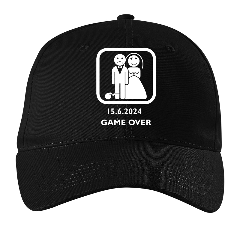 Pánska šiltovka na rozlúčku s klasickou potlačou Game over a dátumom svadby.