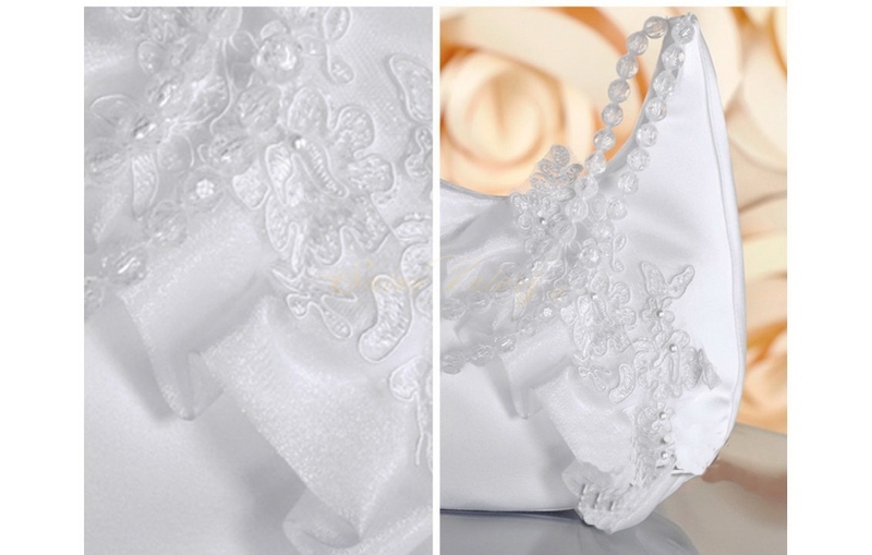 Saténová svadobná kabelka v tvare V s kamienkovým retiazkom, po strane ozdobená jemnou čipkou.