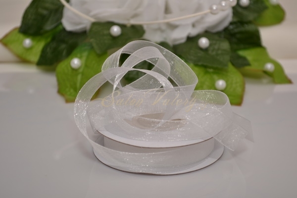 Priehľadná stužka z organzy.Hodí sa pre zdobenie ušiek košíčkov a škatuliek s výslužkou, k preväzovanie valcových sviečok alebo obrúskov na svadobnom stole.