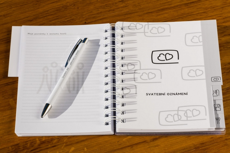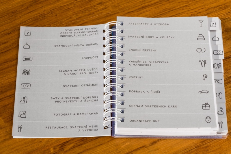 Svadobné diár Smart je rozdelený do 16 záložiek, ktoré sa zaoberajú jednotlivými svadobnými témami.