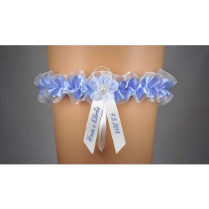 Svadobný čipkovaný podväzok zdobený uprostred modrou saténovou stuhou, ktorá je zdobená kytičkou.