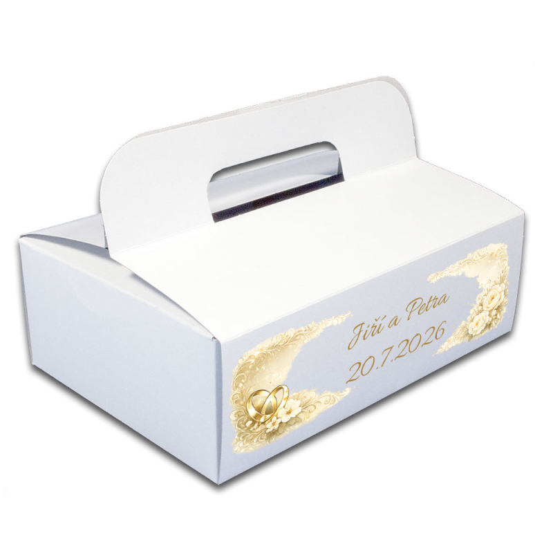 Svadobná krabička na zákusky s elegantným motívom prstienkov je krásny a praktický detail, ktorý spraví z výslužky skutočne slávnostné poďakovanie. Vďaka pevnému spracovaniu a uchu sa pohodlne prenáša a obsah zostane bezpečne chránený aj počas cesty domov.